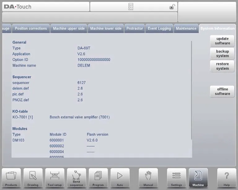 Режим настроек DELEM DA-69T обладает надежными возможностями резервного копирования и восстановления для защиты целостности данных и обеспечения бесперебойной работы гибочного пресса. Система поддерживает резервное копирование и восстановление данных о продуктах и инструментах в формате файла DLC, который совместим с более старыми моделями управления DELEM, что обеспечивает гибкость для легкой защиты критически важных операционных данных.