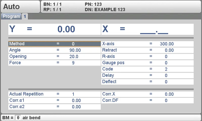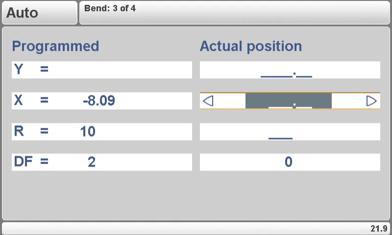 На интерфейсе управления запрограммированные параметры и их рассчитанные данные отображаются над горизонтальной разделительной линией, а значения коррекции параметров расположены под ней. Ключевое преимущество здесь заключается в том, что эти корректирующие значения можно изменять в любое время — даже когда функция блокировки клавиш включена — что обеспечивает возможность точной настройки в процессе гибки для сохранения точности.